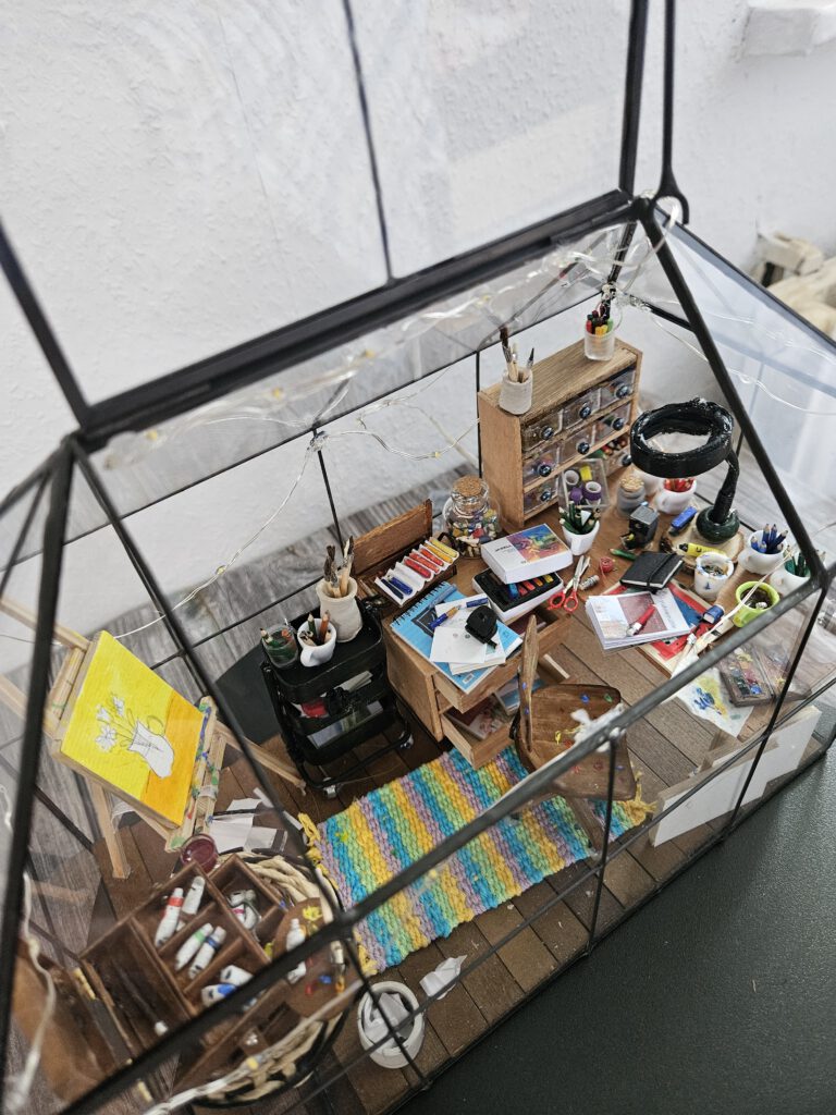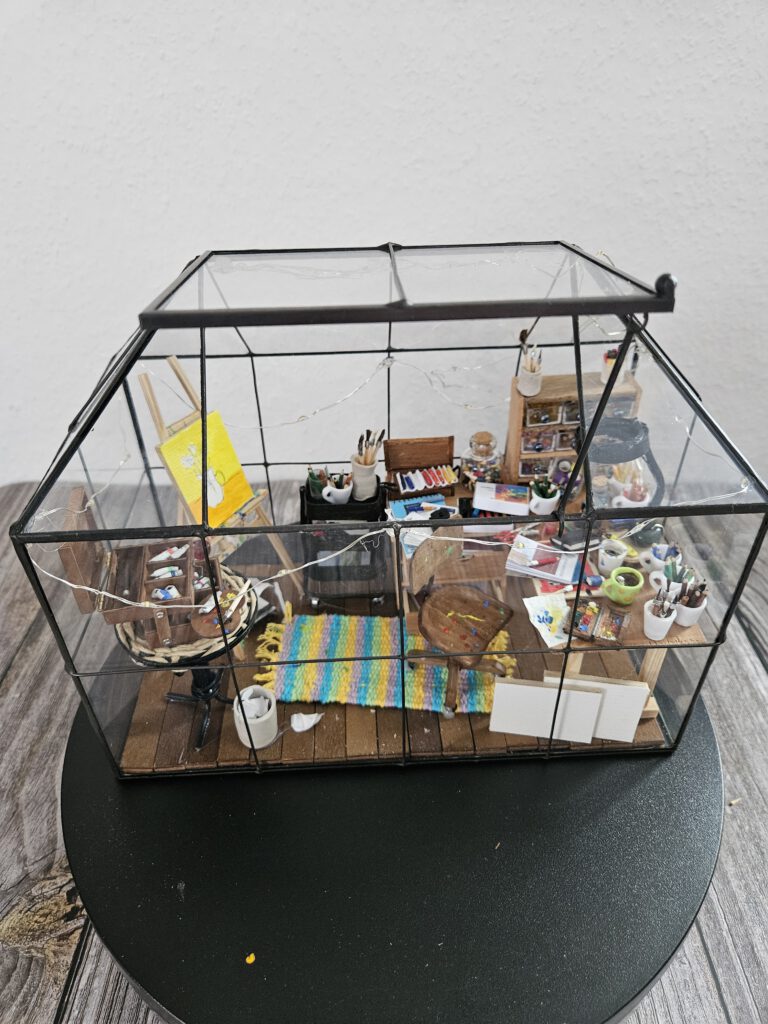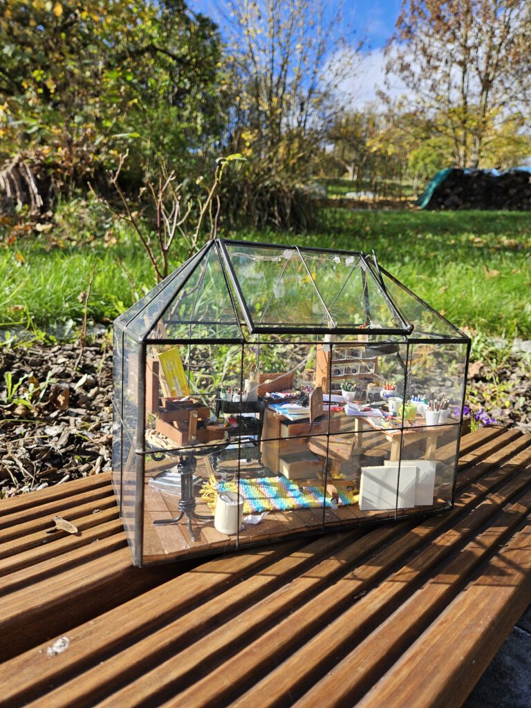 In einem Atelier eines Künstlers/einer Künstlerin ist immer was los und es gibt ganz viel zu entdecken! Stifte, Pinsel, Farben, Blöcke, Schneidemaschine, Staffelei und noch vieles, vieles mehr! Gewächshaus-Diorama mit Licht – batteriebetrieben mit Timerfunktion