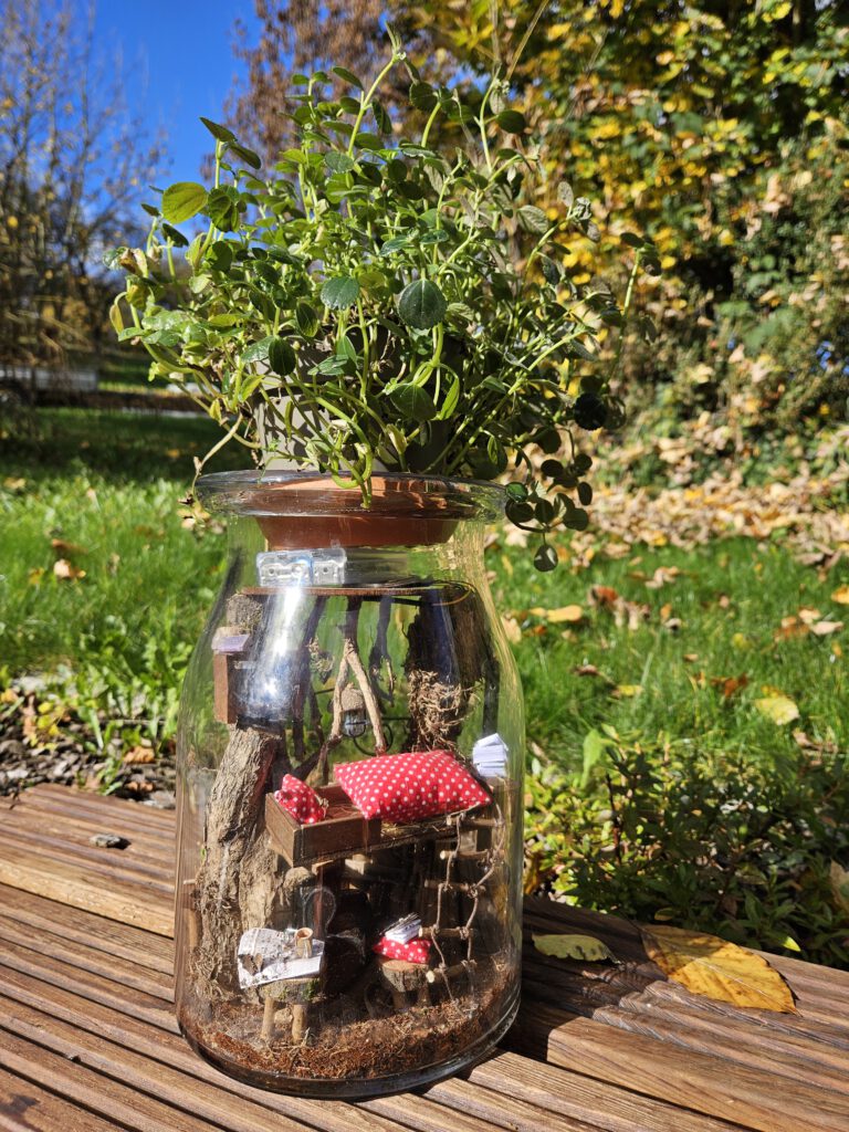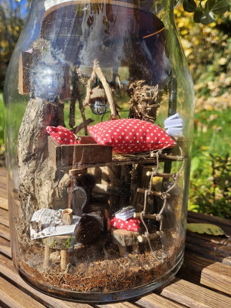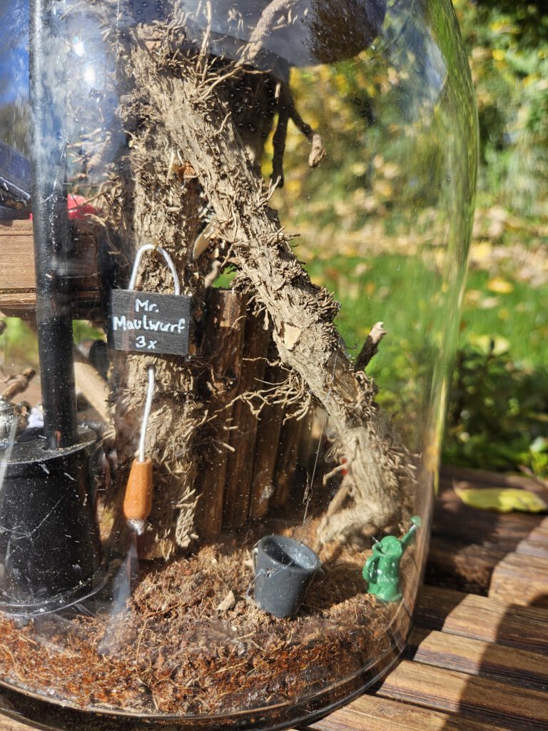 Wie sieht es eigentlich unter der Erde in der Wohnung von Mr. Maulwurf aus? Glasdiorama mit Licht – batteriebetrieben mit Timerfunktion